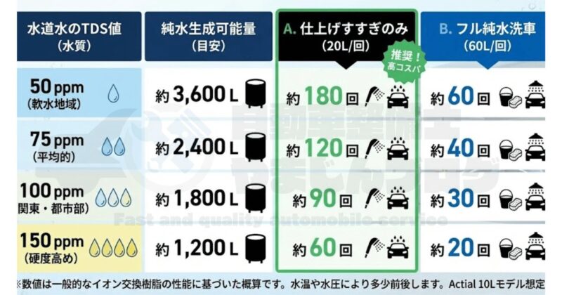 TDS値が100ppmの地域で仕上げのすすぎ洗いにだけ純水を使用すると、90回は洗車できるので1回あたりのコストはわずか90円程度です。